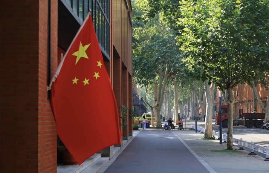 一位小朋友在万象城商场,旁边的五星红旗迎风而舞。