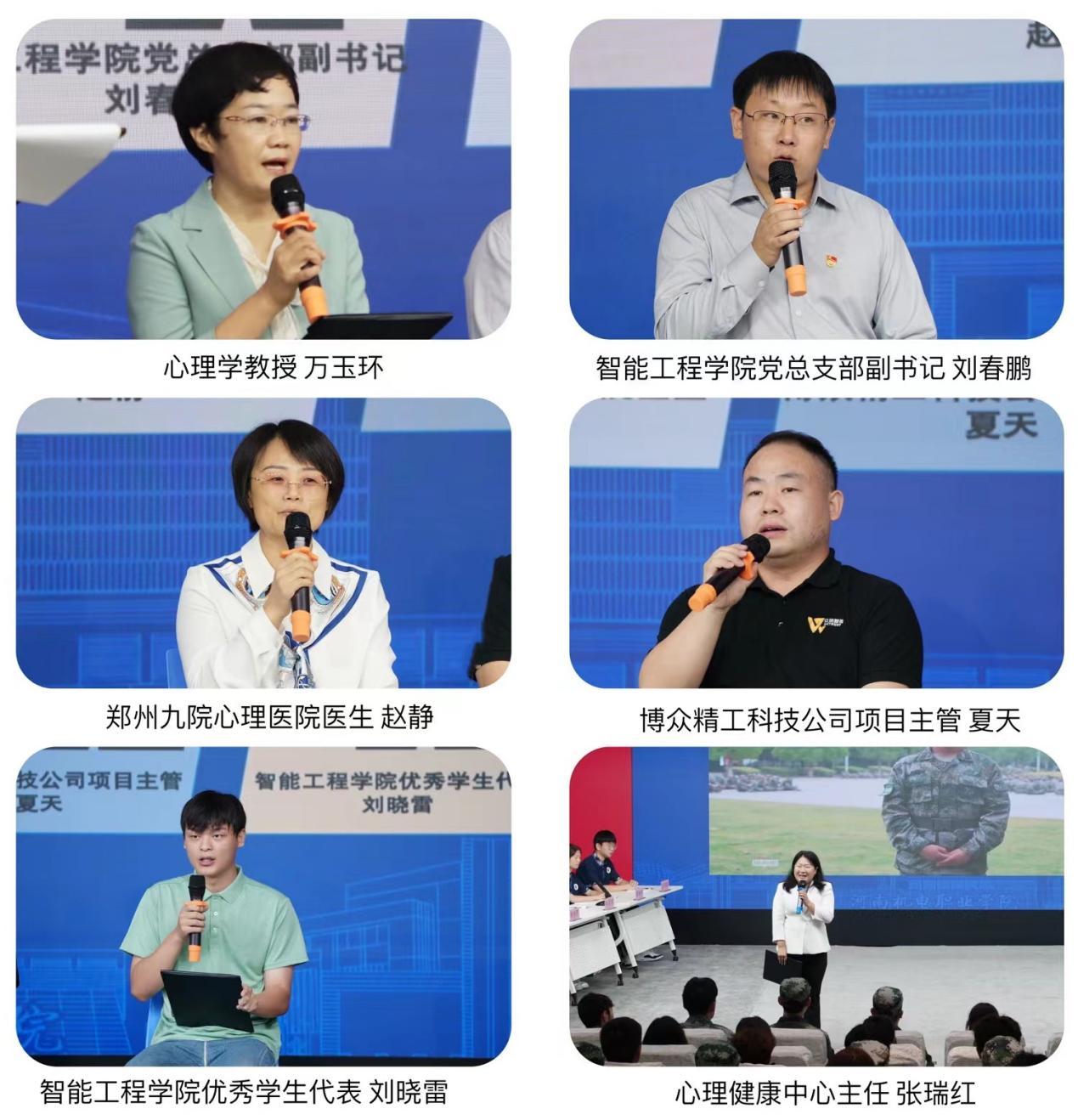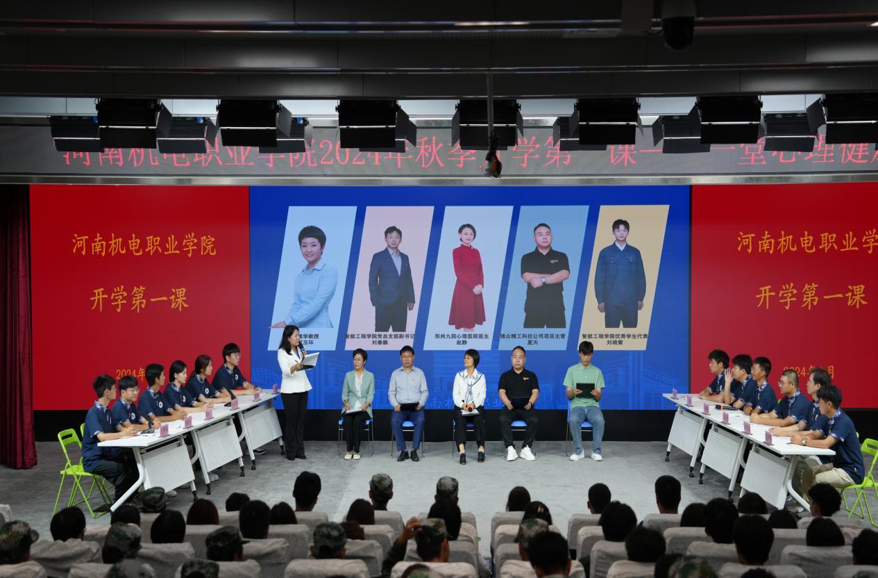 本次开学第一课主题为《与大学生谈生活之“苦”与“乐”》。授课教师为河南机电职业学院学生心理健康教育中心主任张瑞红,马克思主义学院心理学教授万玉环、智能工程学院党总支副书记刘春鹏、郑州市第九人民医院心理医生赵静、博众精工科技股份有限公司项目主管夏天、智能工程学院优秀学生代表刘晓雷,以论坛的形式为2024级新生带来一场别开生面的心理健康大课。