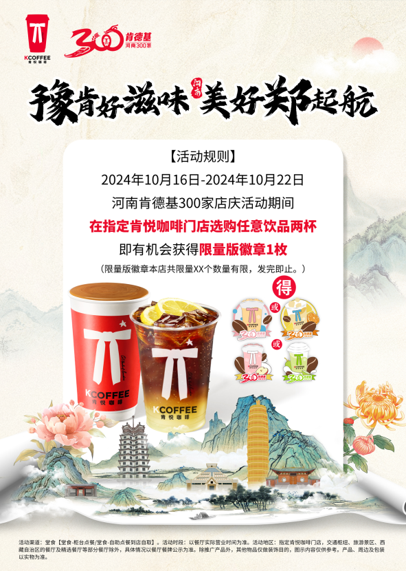 为致敬河南肯德基与消费者携手走过的这段美好历程,10月16日到22日,河南肯德基在全省餐厅(不含流动盘)隆重推出“豫来豫好店庆桶”。顾客在堂食渠道使用肯德基APP凭券购买店庆桶,即可获得一枚河南肯德基300家店庆限定徽章。此徽章共有三款,随机发放,数量有限,发完即止。与此同时,全省25家肯悦咖啡门店也同步开展活动,顾客在堂食渠道购买任意两杯咖啡,便能获得一枚河南肯德基300家店庆限定徽章咖啡款,此徽章共有四款,随机发放,数量有限,发完即止,让更多的消费者感受到河南肯德基的永远好滋味。