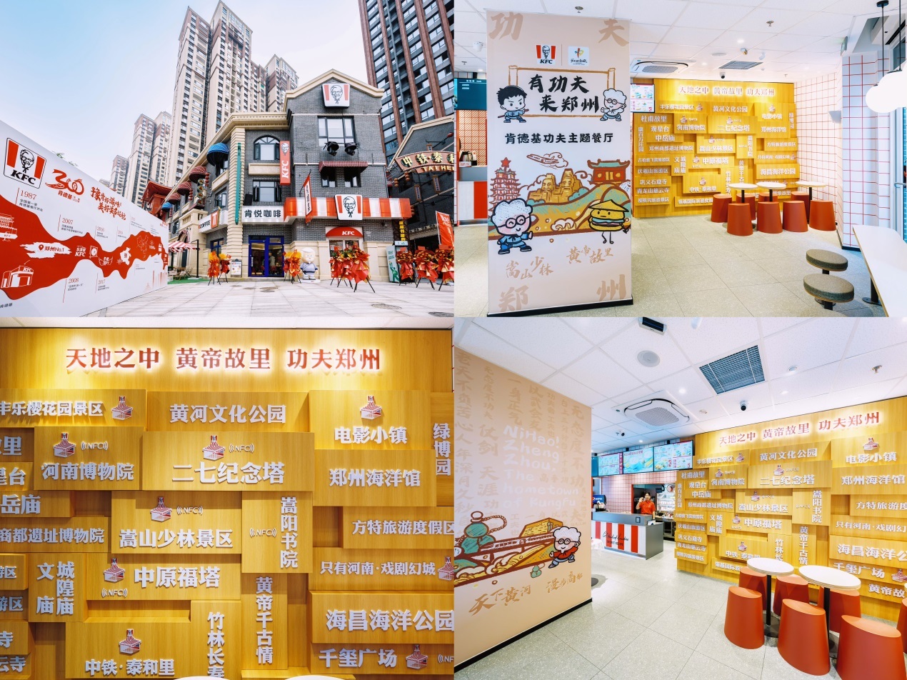 10 月 16 日,河南肯德基 300 家店庆典暨中铁泰和里餐厅开业庆典隆重举行。郑州市文化广电和旅游局与河南肯德基联合将第 300 家门店打造为独具特色的“功夫主题餐厅”,共同开创“餐饮+文旅”的新消费场景,为郑州市的国际消费中心建设持续贡献力量。这家主题餐厅巧妙融入郑州经典景点和文旅元素进行装饰,肯德基老爷爷身着传统功夫服饰,在郑州著名旅游景点中展示中原功夫,或站如松或行如风一招一式尽显郑州与功夫的深厚缘分。他以文旅推荐官的身份,期望让更多人了解郑州的历史文化底蕴,感受这座城市的活力与热情。餐厅内部设有郑州经典景点推荐墙,并利用 NFC 技术进行文旅互动,电视投屏持续播放郑州城市宣传资料。餐厅外的功夫小子打卡墙格外醒目,“有功夫来郑州”的主标题吸引行人驻足。无论是历史文化爱好者还是时尚年轻人,都能在此找到属于自己的郑州印象。