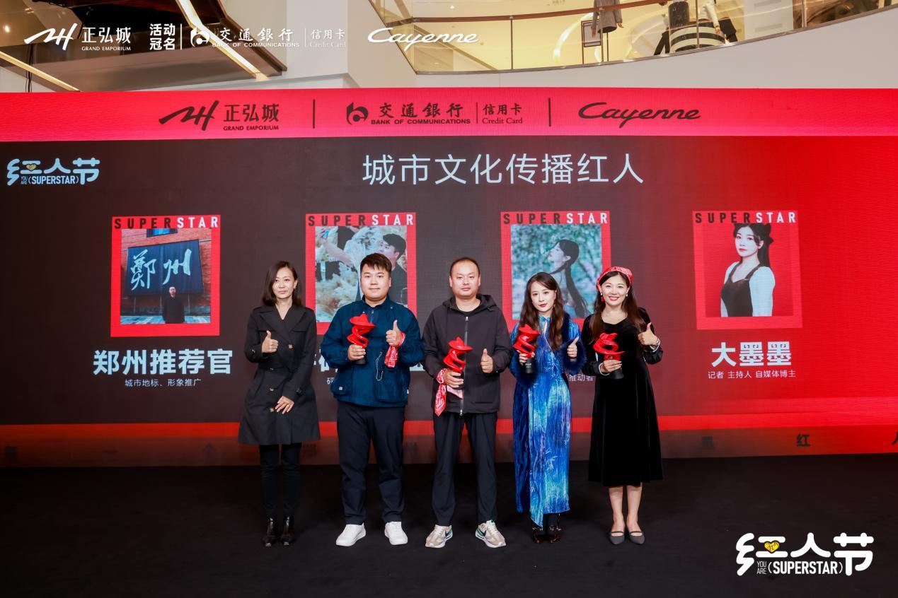 荣获城市文化传播红人的分别是:用航拍记录城市的郑州推荐官李赟;郑州商业观察者彭硕;郑州二次元行业推进者琥珀川;有记者、主持人和自媒体博主多重身份的大墨墨。