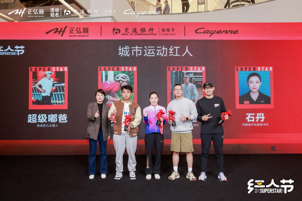 荣获城市运动红人的分别是:有成色跑者俱乐部主理人超级嘟爸;智爱骑士骑行团负责人小浩;户外运动、井派文化创始人井鑫;河南省乒协副秘书长石丹。