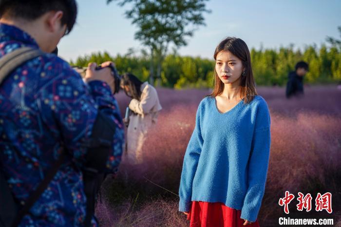 图为市民与粉黛乱子草合影。中新社记者 李超庆 摄