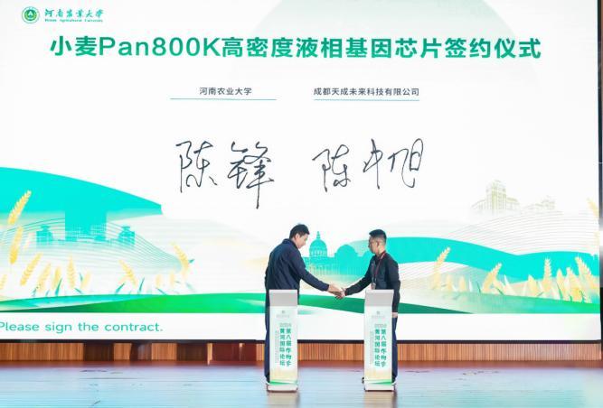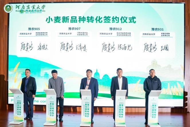 开幕式上,河南农业大学陈锋团队小麦基因芯片技术开发代表与成都天成未来科技有限公司签署专利技术转让协议,转让经费1500万元。河南农业大学小麦新品种选育团队殷贵鸿分别与陕西富麦粮丰种业科技有限公司、河南岁盈农业科技有限公司、新乡市金苑邦达富农业科技有限公司、安徽华皖种业有限公司企业代表现场进行签约。本次签约包括豫农907、豫农905、豫农912、豫农931四个小麦新品种转让经费总计1040万元。