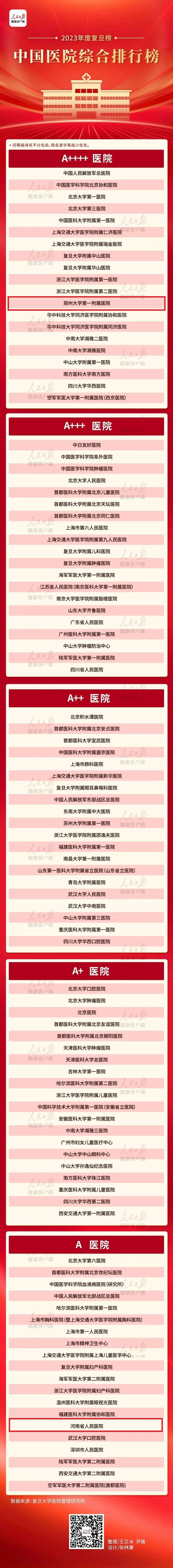《2023年度中国医院综合排行榜》共分A++++、A+++、A++、A+和A五个等级,每个等级20家医院,其中,郑州大学第一附属医院获评A++++,河南省人民医院获评A。