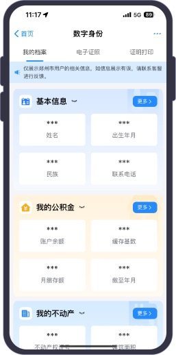 据介绍,“数字身份”可进行档案查询、电子证照、证明打印等服务。其中,档案查询可查询个人基本信息、公积金缴纳情况、不动产情况、教育信息、社保信息、医保信息、车辆信息、婚姻信息。电子证照可查看具有法律效力和行政效力的专业性、凭证类电子文件,身份户籍(电子身份证、电子居住证、电子户口簿)、出行证件(电子驾驶证、电子行驶证)、医保电子凭证、不动产登记证书、各类资格证书电子证照、电子批文批复。