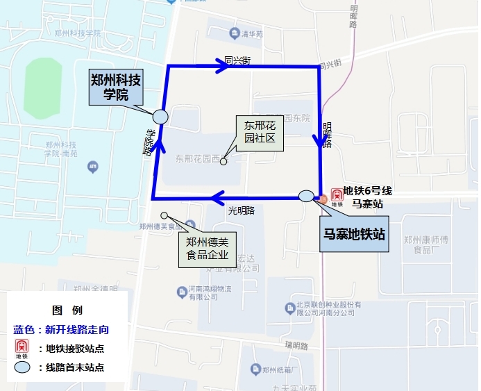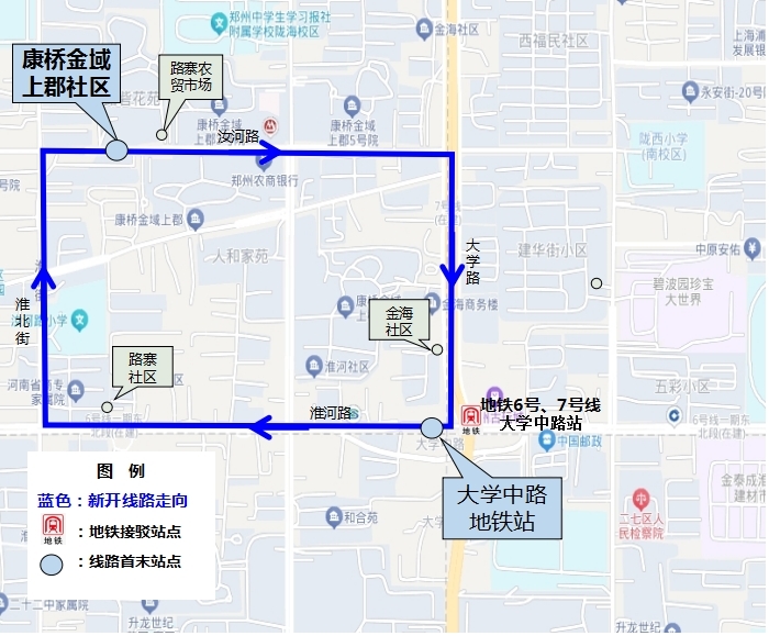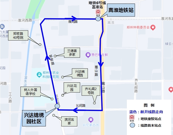 途经道路:郑密路、淮河路、嵩山路、沁河路。