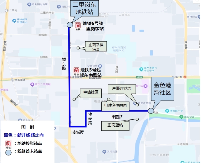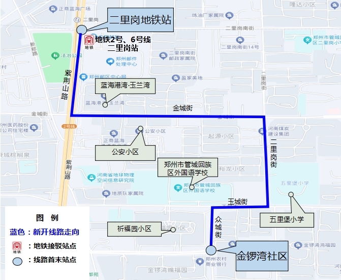 途经道路:众城街、玉城街、二里岗街、金城街、紫荆山路。