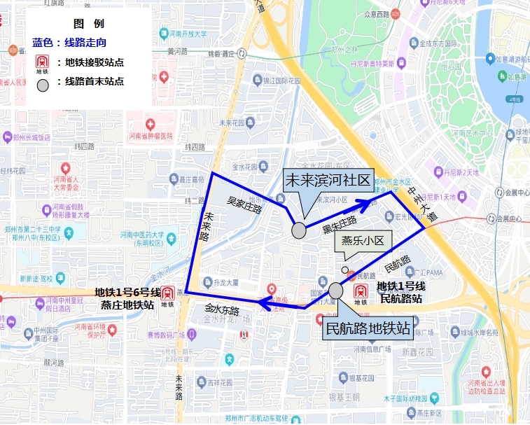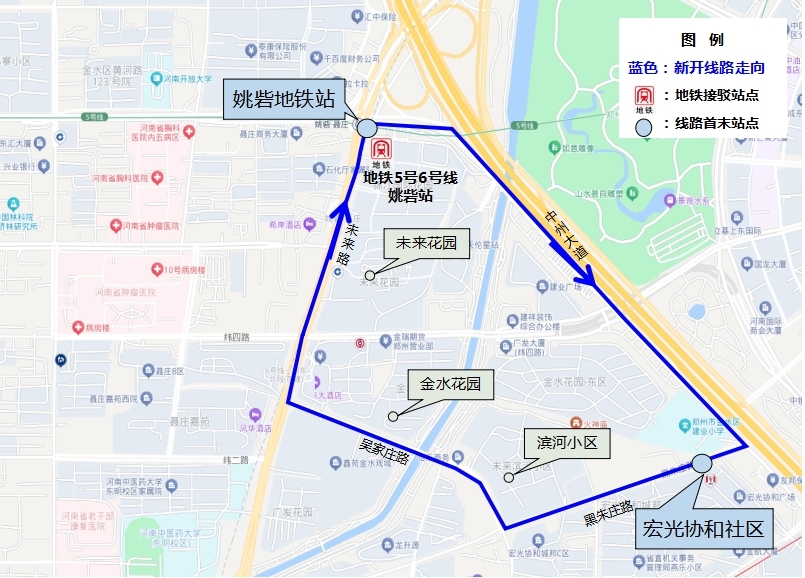 途经道路:吴家庄路、黑朱庄路、中州大道、民航路、金水路、未来路。