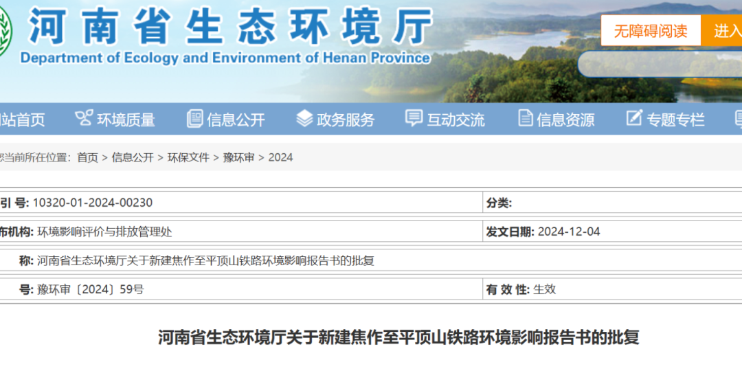 记者从河南省生态环境厅官方网站上了解到,12月4日《河南省生态环境厅关于新建焦作至平顶山铁路环境影响报告书的批复》印发项目开工进入倒计时,全线将新设立5座车站。