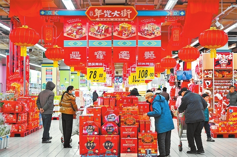 1月10日,开封市一大型商场内,市民正在选购年货。春节临近,开封市年货市场生意红火,人们纷纷采购各种年货,到处洋溢着浓浓的年味。(李俊生 摄)