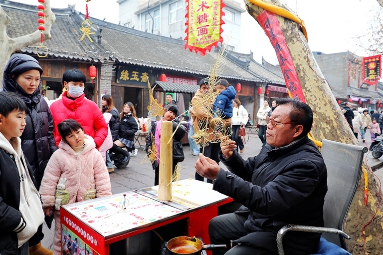 2月3日,在襄城县明清古街新年庙会上,一位民间艺人正在制作糖画。吕科 摄