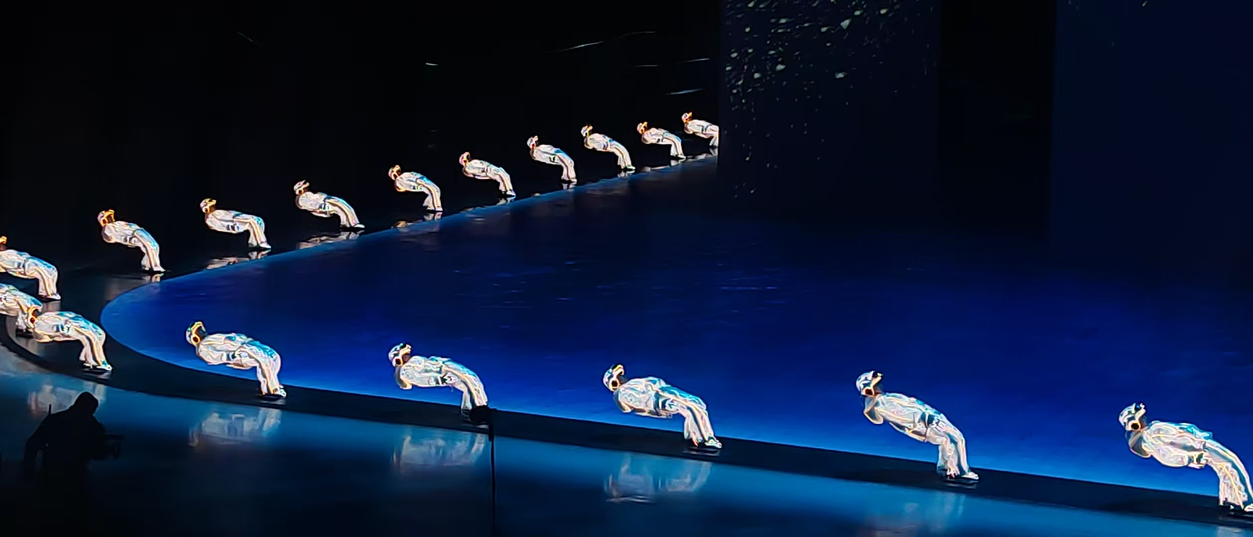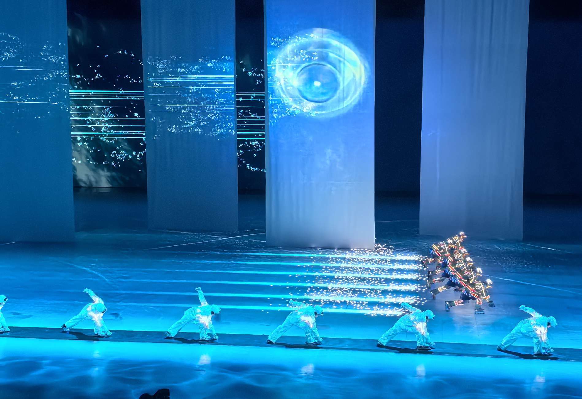 在全场瞩目的《驰骋天地间》节目里,42名塔沟少年身着白色荧光服,如灵动的雪花,随着舞台幻化为深邃的深蓝色冰面,少年们穿着特制的倾倒鞋稳步入场,瞬间点燃了现场的气氛。鞋子叩击冰面的清脆声响,与动感的电子节拍完美契合,奏响了一曲充满活力的冰雪乐章。高山滑雪、自由式滑雪、单板滑雪等50多种冰雪运动的经典动作,在他们的演绎下流畅自然,一气呵成。