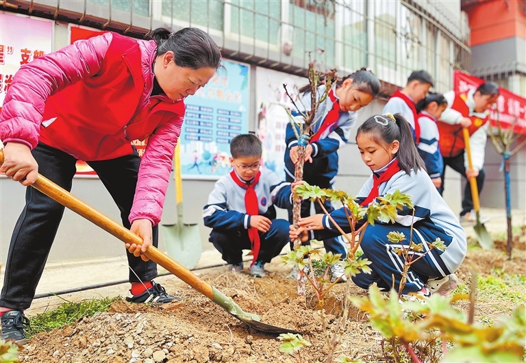 3月11日,洛阳市涧西区实验小学的学生们与重庆路街道二社区志愿者们共同开展植树活动。黄政伟 摄