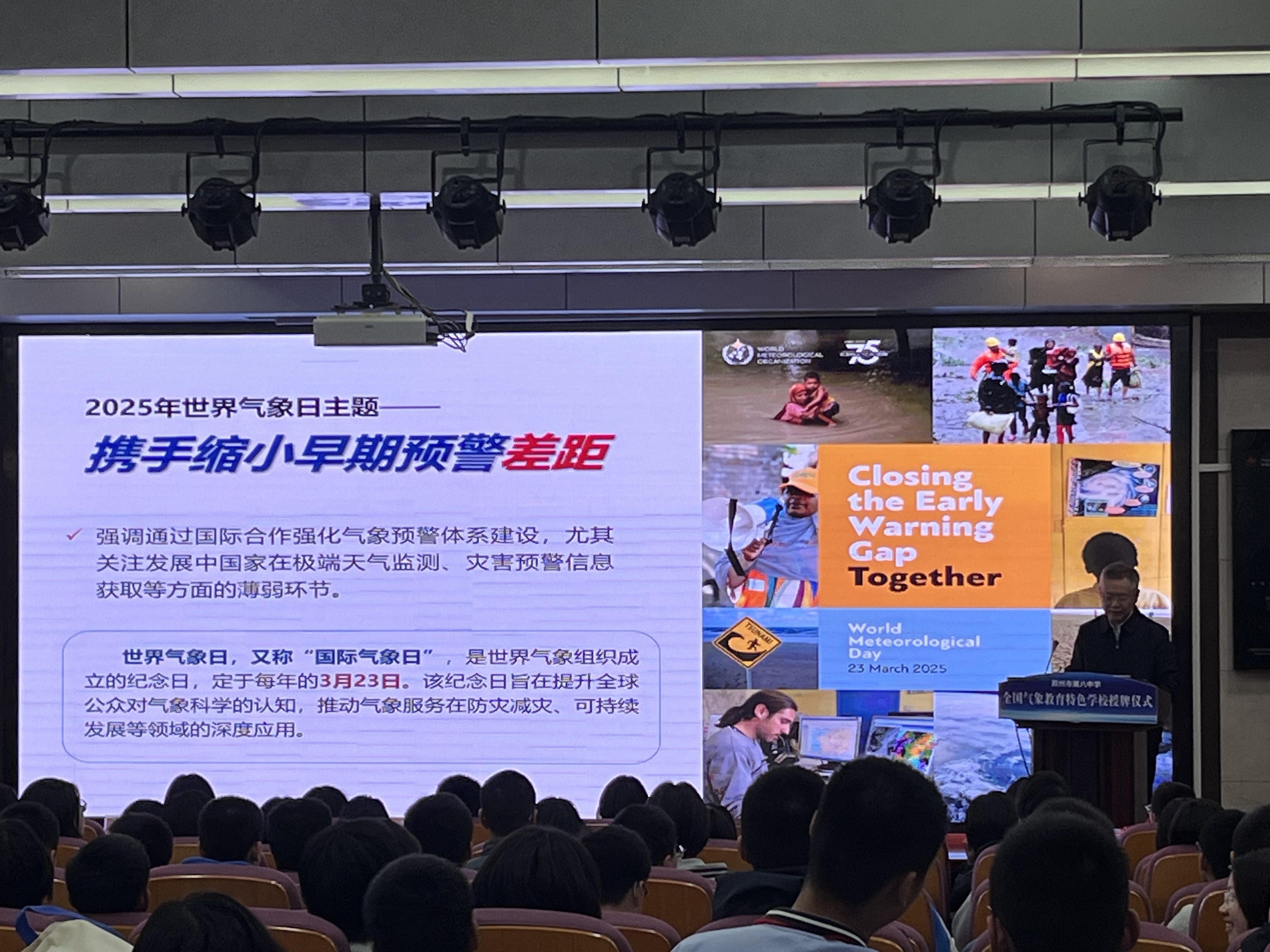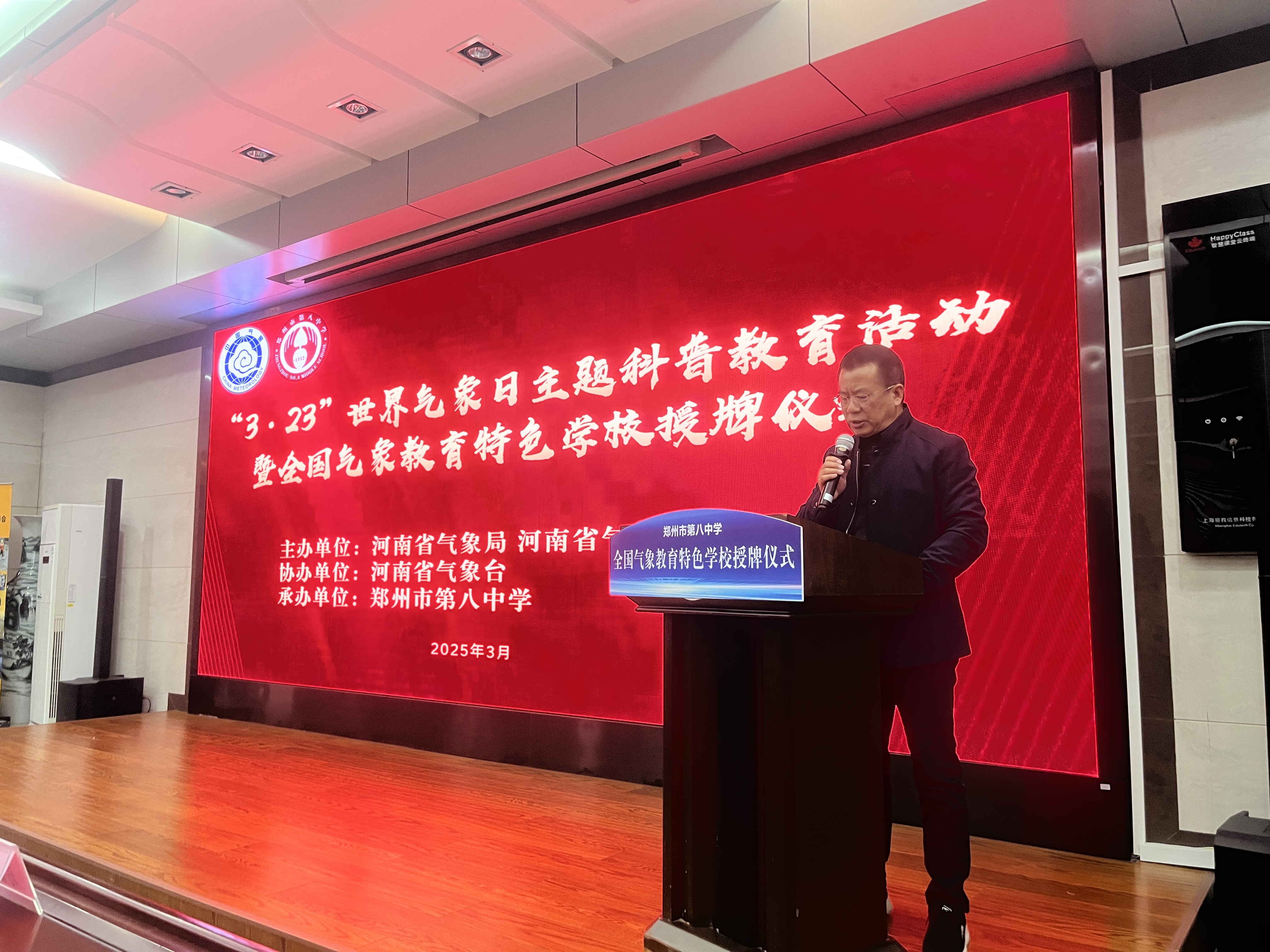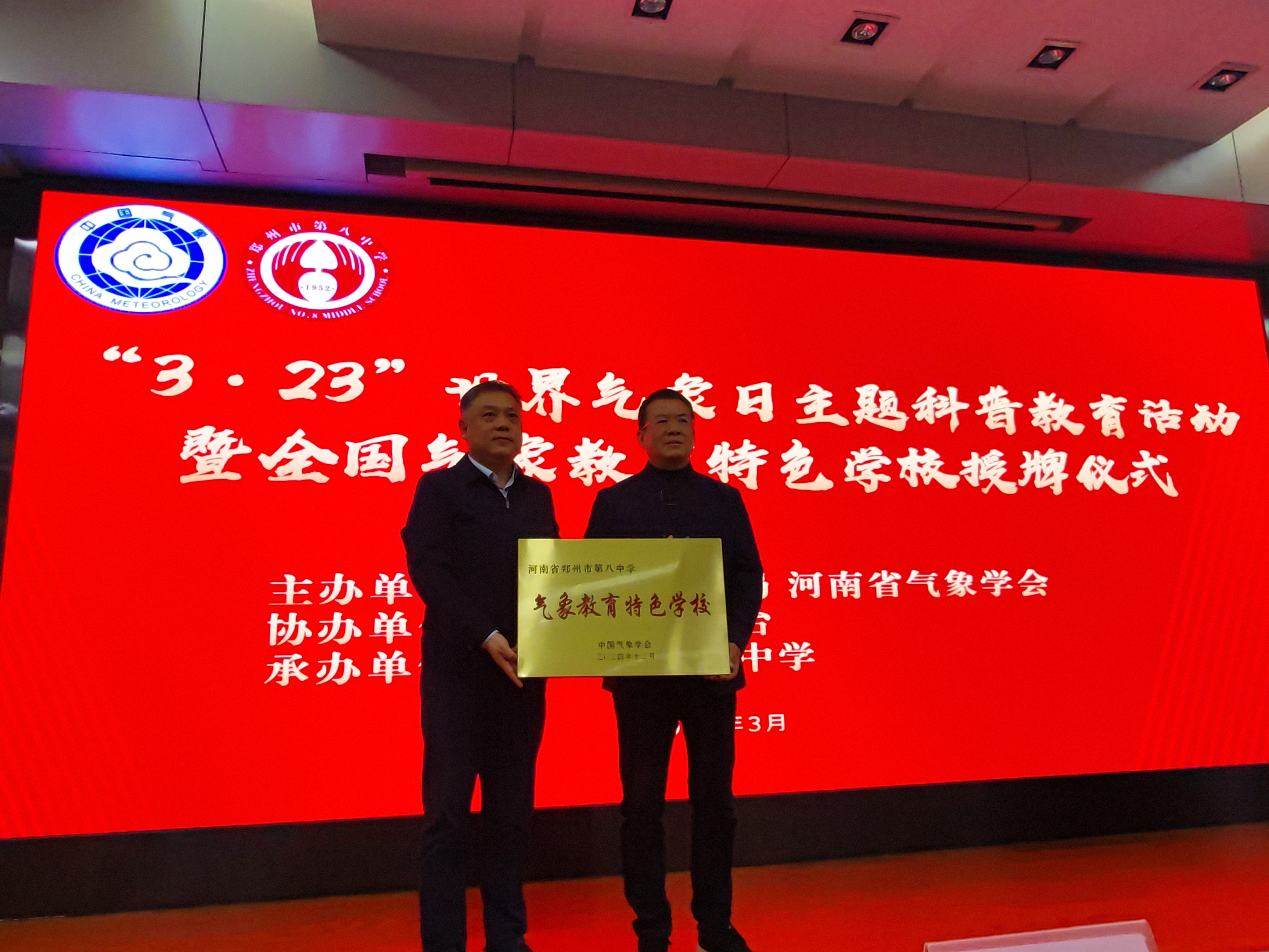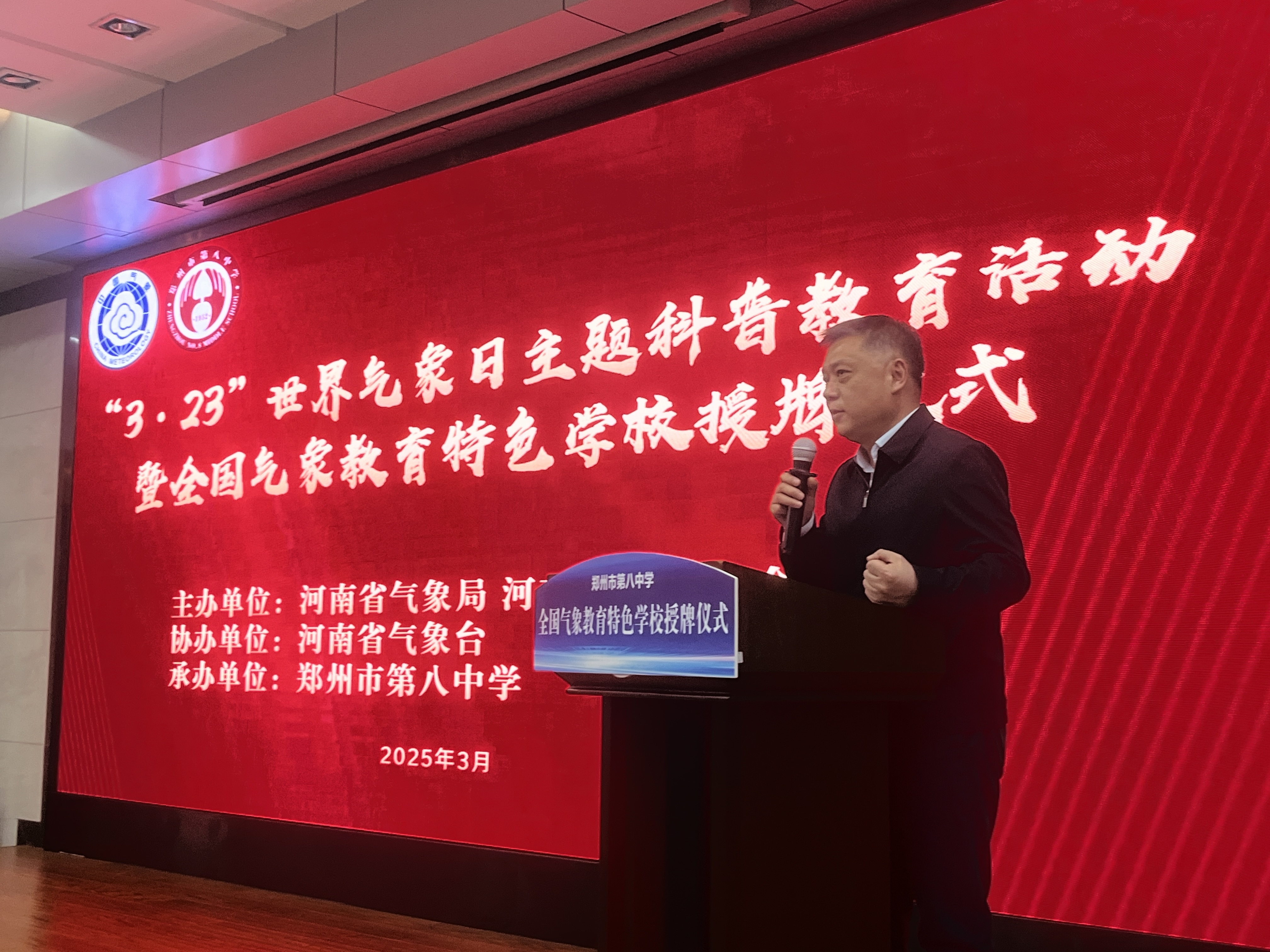 为充分发挥气象教育特色学校在科普教育中的示范作用,3月21日下午,由河南省气象局、河南省气象学会主办,河南省气象台协办,郑州八中承办的2025 年“3・23”世界气象日——气象知识进校园暨全国气象教育特色学校授牌仪式在郑州八中报告厅举行,240名师生代表及相关领导参加。