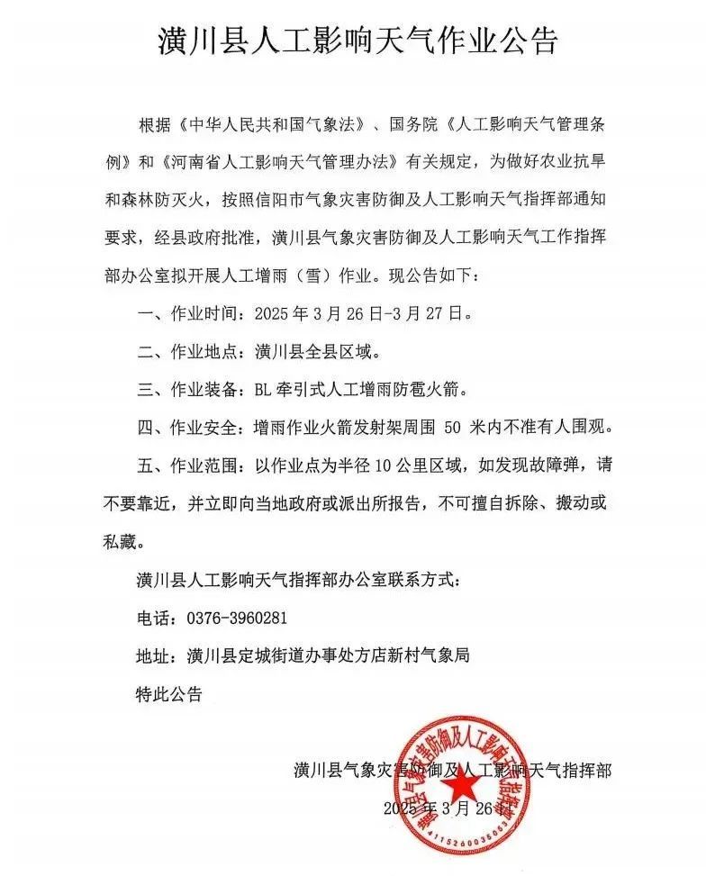 根据《中华人民共和国气象法》《人工影响天气管理条例》和《河南省人工影响天气管理条例》等有关规定,按照信阳市气象灾害防御及人工影响天气指挥部通知要求,经县政府批准,拟于2025年3月26日至27日组织开展森林防灭火人工增雨作业。现将开展人工增雨作业有关事项公告如下: