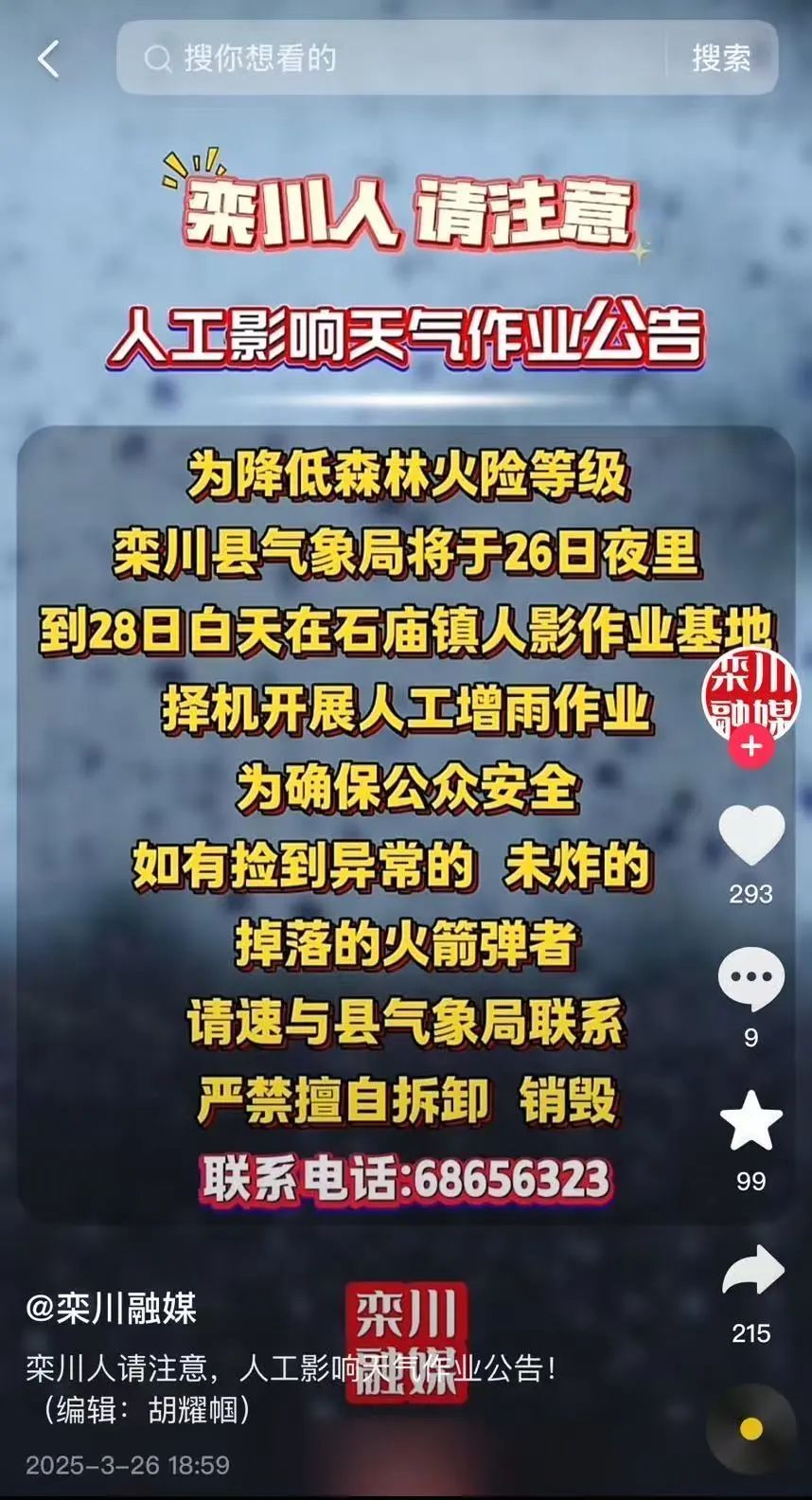 河南多地决定于3月26日-28日,适时实施人工影响天气作业(即人工增雨)。提醒大家,如发现故障弹或者火箭弹残骸,不要靠近,并且立即向当地政府或派出所报告,不可擅自拆除、搬动或储藏。