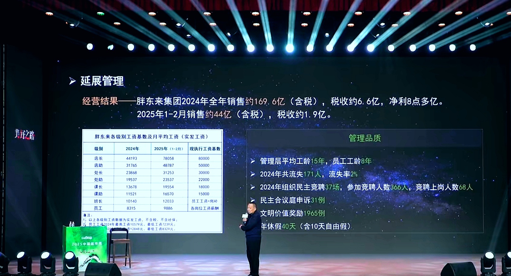 在豫商大会前,2025中国超市周活动现场,于东来公布了胖东来员工工资情况。去年胖东来普通员工,月平均工资为8315元。而今年以来,则提高到了9886元。