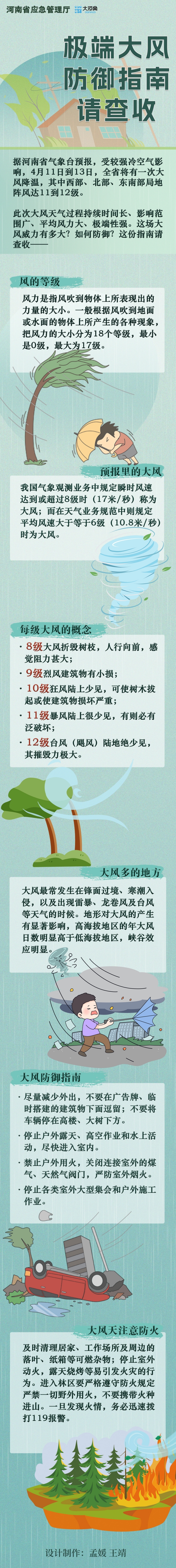 据河南省气象台预报,受较强冷空气影响,4月11日至13日,全省自西北向东南转西北或偏北风5到6级,阵风8到10级,西部、北部、东南部局地达11到12级,全省大部伴有浮尘或扬沙。与此同时,预计今天黄河以南和东北部有分散性阵雨、雷阵雨;东南部局地有中雨,并伴短时强降水、雷暴大风等强对流天气。