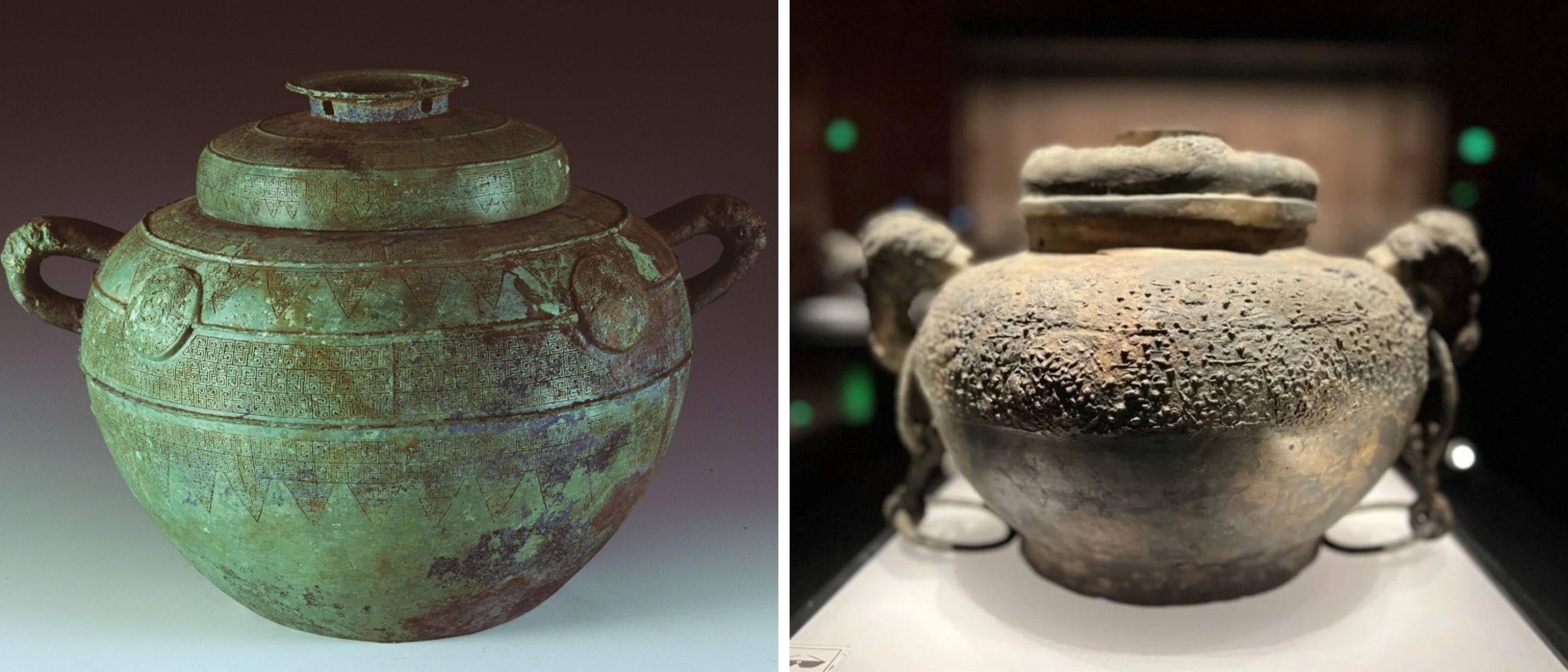 △左为春秋·蟠虺纹铜浴缶,湖南博物院藏。右为战国·带盖蟠虺纹铜浴缶,四川博物院藏。