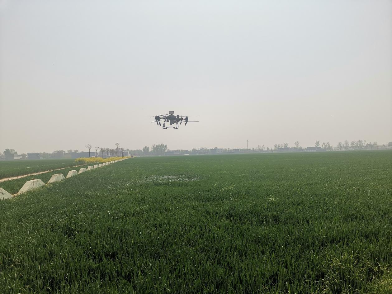 4月14日上午,4架无人机在郏县薛店镇高标准农田上空盘旋,水雾似的药液均匀洒落在青青麦苗上。种地大户李水群说:“眼下正是小麦一喷三防的关键时期,有无人机给小麦进行飞防,真是省心省时又省力!”