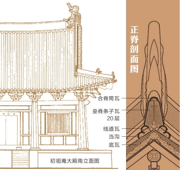 初祖庵大殿为单檐九脊殿,所谓“九脊殿”,其实就是业界所称的“歇山顶”。歇山顶共有九条屋脊,即一条正脊、四条垂脊和四条戗脊,因此又称“九脊顶”。