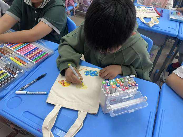 有的同学选择了自己喜欢的牡丹花图案,用鲜艳的色彩描绘出花朵的娇艳欲滴和层层叠叠的花瓣,仿佛将一朵盛开的牡丹绽放在了帆布袋上,有的同学则对古朴典雅的云纹情有独钟,用细腻的笔触勾勒出云纹的流畅线条,仿佛让帆布袋上飘起了一朵朵灵动的祥云,还有的同学将多种纹样组合在一起,创造出了属于自己的独特图案,让自己的帆布袋更具创意和美感。一时间,教室里充满了欢声笑语,五彩的画笔在帆布袋上舞动,一幅幅充满童趣又饱含传统文化韵味的作品应运而生。活动结束后,同学们纷纷展示着自己的得意之作,脸上洋溢着自豪与喜悦。