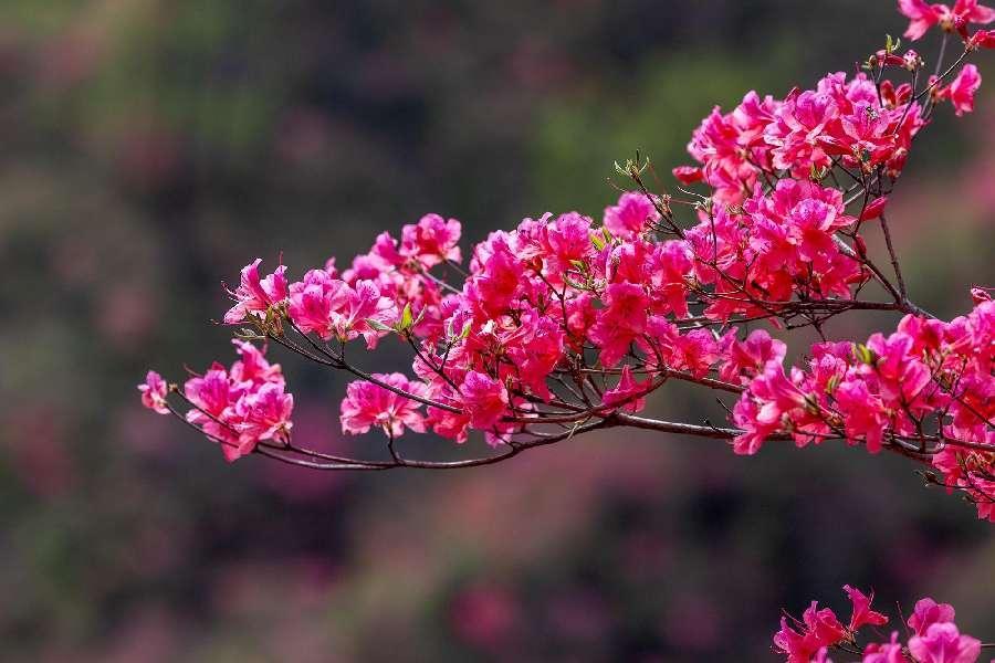 20余万株野生杜鹃迎春怒放,红的似火,紫的如霞,粉的若云,层层叠叠的花潮从岭脊如瀑布般倾泻至沟底,连空气中都弥漫着清甜的芬芳。单株杜鹃亦姿态万千:有的孤芳自赏,亭亭玉立如绰约仙子;有的簇拥成团,如锦缎铺陈、彩练当空,在阳光的轻抚下闪烁着细碎的光芒。微风拂过,花枝轻颤,花瓣簌簌飘落如红雨纷飞,与远处翻涌的云海共同谱写出一曲春日的浪漫乐章。