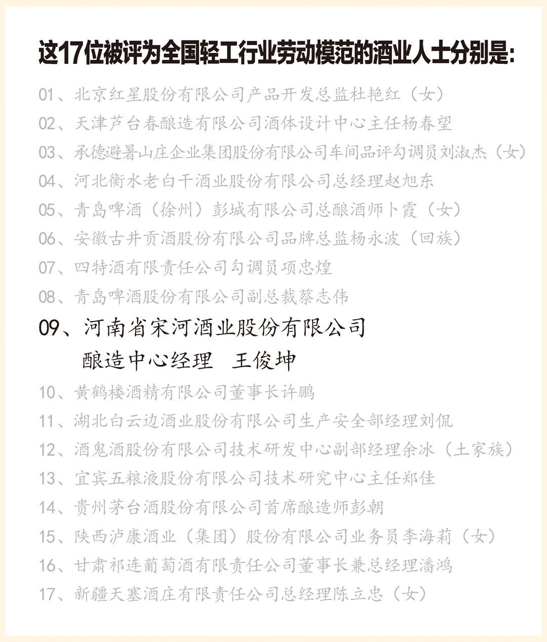 由人力资源社会保障部、中国轻工业联合会、中华全国手工业合作总社联合评选的全国轻工行业劳动模范名单出炉,17位酒业人士被评为全国轻工行业劳动模范,作为豫酒代表的来自宋河酒业酿造中心的王俊坤荣耀入选,且是豫酒行业唯一入选人员。
