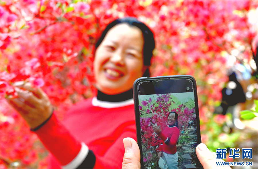 4月23日,在河南省汝阳县西泰山,游客在花丛中拍照。