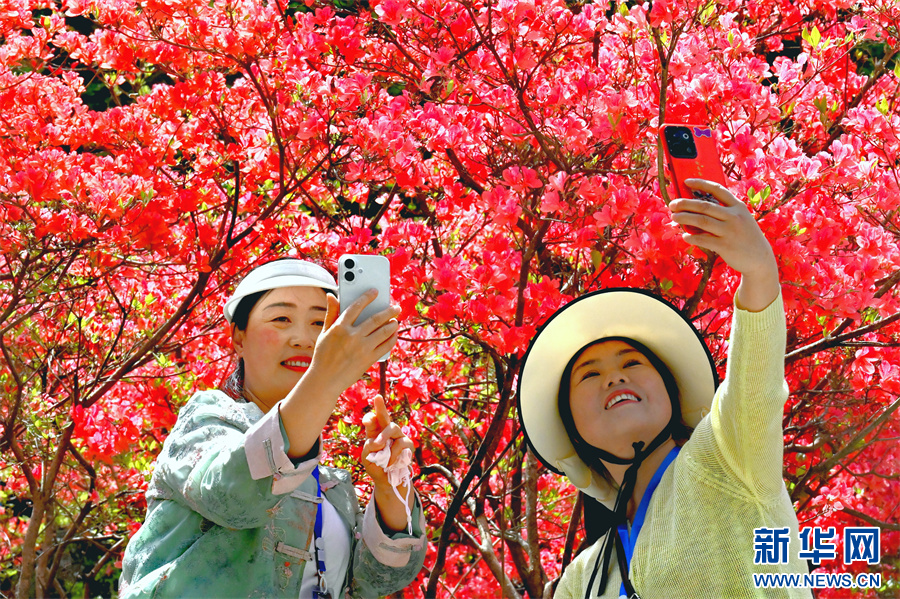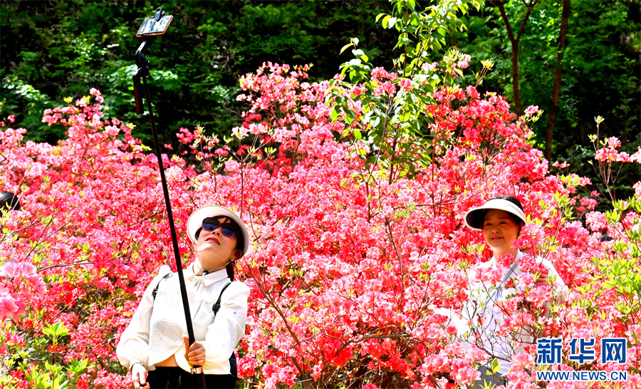 近日,河南省汝阳县西泰山的杜鹃花进入盛花期,绵延的花廊如绚丽锦缎,铺满山峦沟壑,吸引不少游客前来赏花观景。新华网发(高山岳 摄)