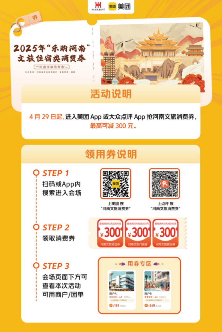 在美团、大众点评平台设置专属线上“河南文旅消费券”活动页面,用户在平台搜索“河南文旅消费券”,进入活动页面点击“领取”按钮即可获得酒店住宿、景区门票、跟团线路的河南文旅消费券;或可查看页面专区内参与活动的酒店/景区,在预订客房/景点门票时点击“领券订”按钮,即可有机会获得酒店住宿、景区门票的“河南文旅消费券”;也可线下通过扫描活动页面二维码参与活动。在活动周期内,同一用户可使用一张河南文旅酒店券,一张河南文旅门票券和一张河南文旅跟团券,最多可使用三张。成功领取的消费券可在“美团App—我的—红包卡券—我的券”或“大众点评—我的—卡券—券包”页面查看。活动期间,消费券数量有限,领完即止。