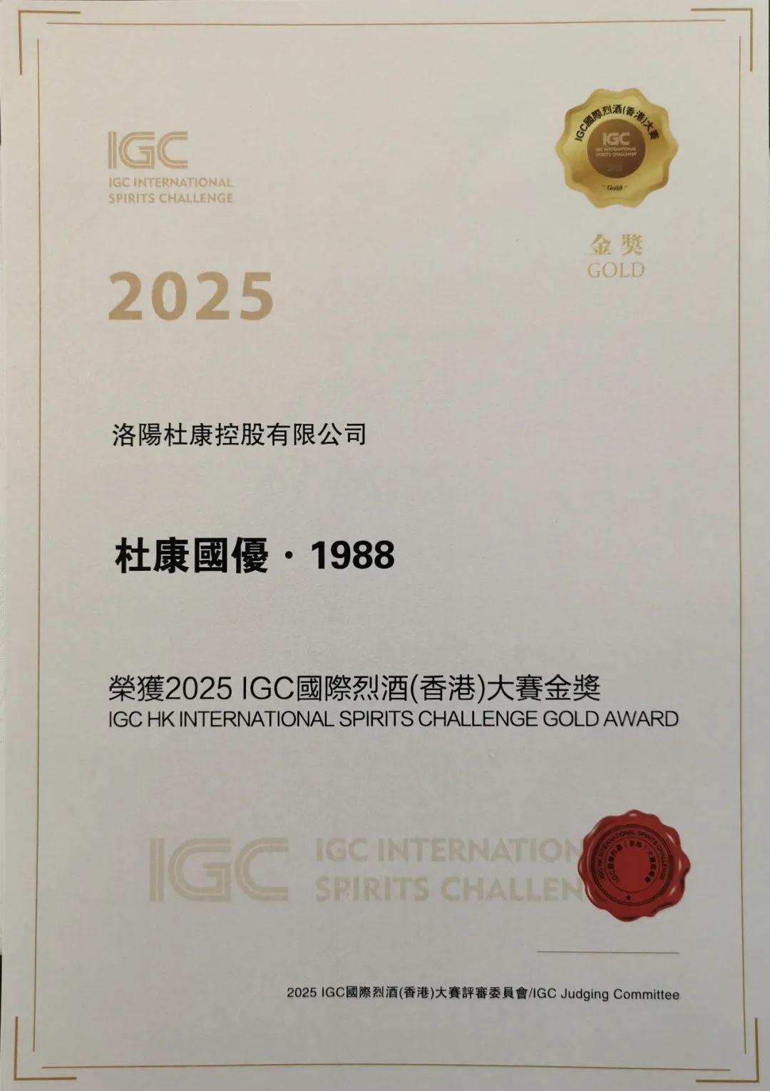 如今,杜康酒·国优1988不负众望,再次拿下IGC国际烈酒(香港)大赛金奖,让杜康的名字闪耀在世界舞台。以“酒祖”之名,为中国白酒行业注入新的信心与活力。