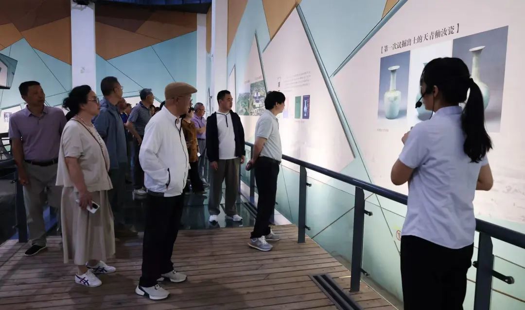 考察团一行还来到清凉寺汝官窑遗址展示馆实地考察了宋代汝窑的窑炉、釉料坑、澄泥池等考古遗迹,深入了解汝官窑的发掘历程与历史地位。在汝窑博物馆,历代经典汝瓷作品让考察团成员深刻感受到汝瓷文化的深厚底蕴。徐朝兴表示,到宝丰清凉寺汝官窑遗址展示馆和汝窑博物馆看看,是我们一行很多大师梦寐以求的心愿,这次愿望实现,都很高兴,两馆承载着中华陶瓷文明的精髓,其保护与传承具有重要意义。