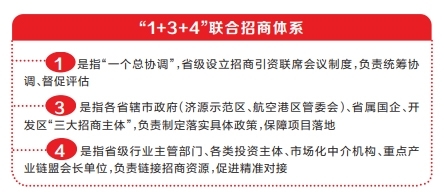 《意见》提出,构建“1+3+4”联合招商体系。其中,“1”是指“一个总协调”,省级设立招商引资联席会议制度,负责统筹协调、督促评估;“3”是指各省辖市政府(济源示范区、航空港区管委会)、省属国企、开发区“三大招商主体”,负责制定落实具体政策,保障项目落地;“4”是指省级行业主管部门、各类投资主体、市场化中介机构、重点产业链盟会长单位,负责链接招商资源,促进精准对接。
