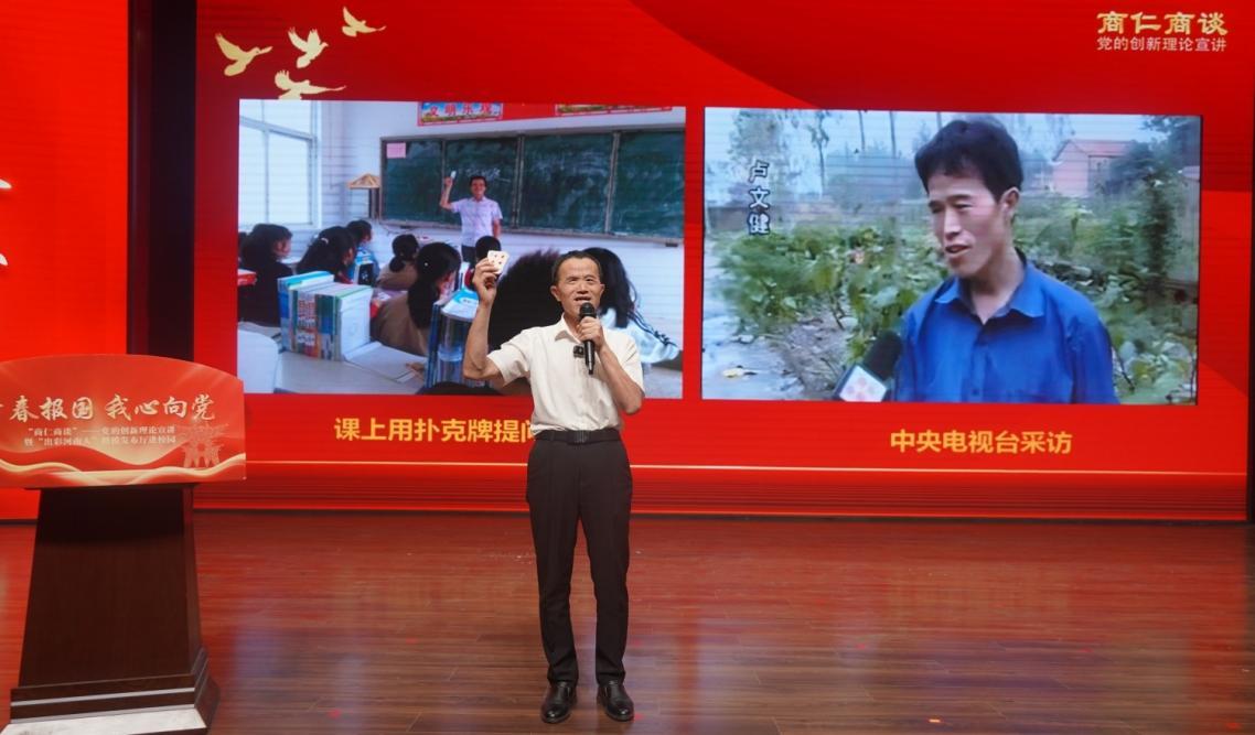 2025全国自强模范、“出彩河南人”2022感动中原年度人物,商丘虞城站集镇第三初级中学卢文建老师在宣讲中以《三尺讲台系国运,我将无我守初心》为题,分享了自己向学生和家人“借眼”备课、坚守讲台30多年的工作经历,用坚守与热爱诠释了人民教师的初心使命。并在现场以快板书的形式,展示了他独创的“卢氏教学法”,吸引了同学们的目光,也让同学们感受到老师对教学的热情。