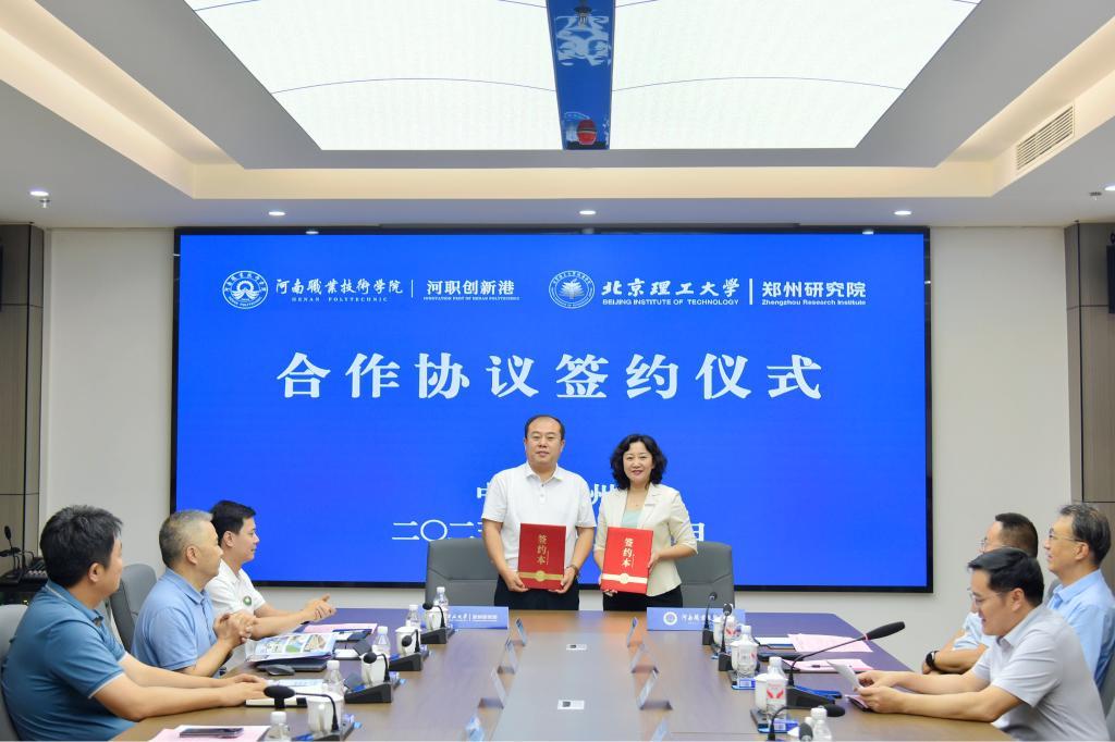 6月23日上午,河南职业技术学院与北京理工大学郑州研究院战略合作协议签约仪式在河职创新港举行。北京理工大学郑州研究院常务副院长柏利、副院长张学智,郑州技术交易市场运营负责人、郑州中原科技成果转化有限公司总经理车中锐,河南职业技术学院党委书记厉励,党委副书记、校长夏新颜出席会议。双方相关部门和科研平台负责人参加会议。校党委委员、副校长任枫轩主持仪式。