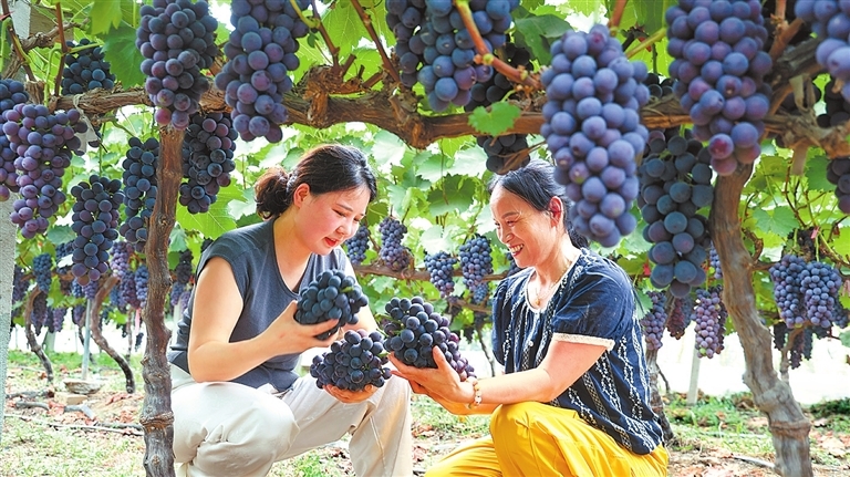 6月23日,市民在柘城县牛城乡史庄村的“前皇夏黑阳光玫瑰葡萄采摘园”里采摘葡萄。近年来,当地积极发展特色种植产业,在为村民铺就甜蜜致富路的同时,也为乡村发展注入新动能。张超 摄