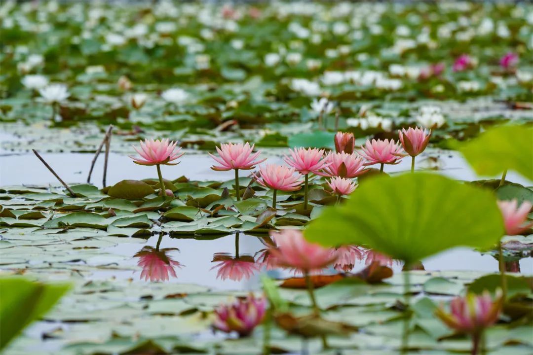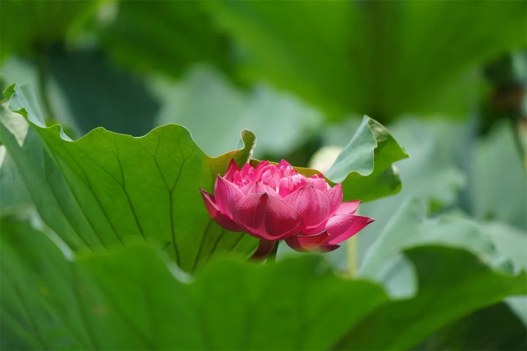 小暑荷风至,拂过紫荆山公园满池接天摇曳的荷花,碧荷翩跹,暗香浮动,花瓣尖上的那一点赤红,轻摇慢晃,似缱绻的红云舒展开柔软的身姿。池塘里的荷叶更是将这绿演绎到了极致,它们层层叠叠,绿得深沉,是大自然调色盘中最浓郁的绿,又像是翡翠般晶莹剔透,宛若画中游。