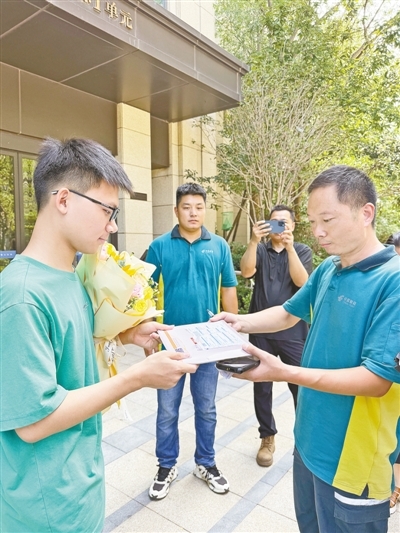 7月13日下午3:07,在郑州市金水区国基路街道宏安路136号康桥朗城小区内,惠济区邮政分公司香山路揽投部揽投员屈贯岭、张二兵在核对相关证件后,将来自清华大学的首封高考录取通知书郑重地交到了考生李泽铭同学的手上(如图),并送上了鲜花和美好祝福。