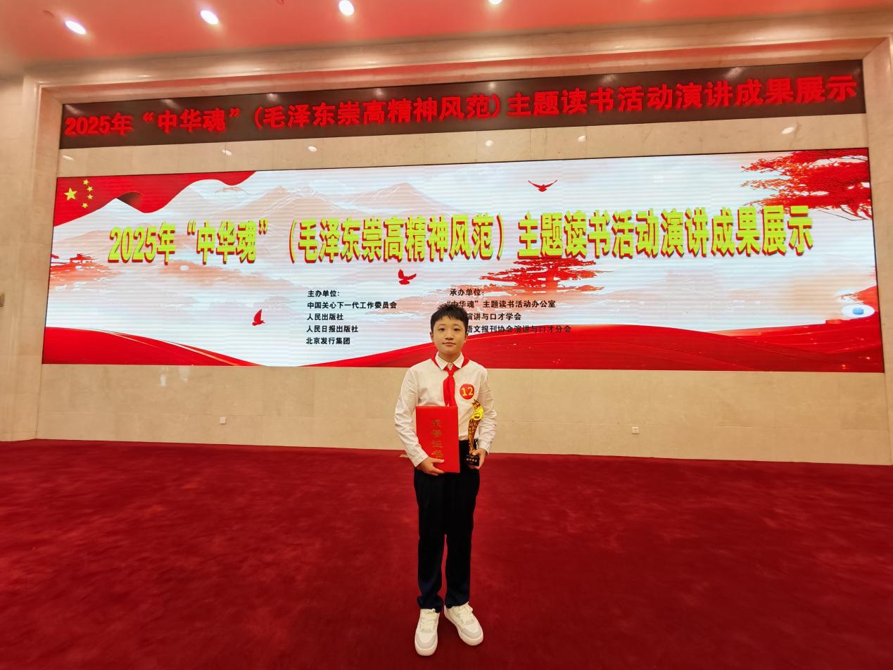 7月15日上午,全国“中华魂”(毛泽东崇高精神风范)主题读书活动演讲成果展示圆满落幕。来自全国20多个省级行政区的65名优秀选手同台竞技,分为青年组、中学组和小学组展开激烈角逐。最终,来自漯河小学六十班的胡润泽以98.3分的全场最高分,斩获小学组全国特等奖,并位列所有参赛选手第一名!这一成绩不仅刷新了漯河市在该项赛事中的历史最佳纪录,更展现了漯河少年昂扬向上的精神风貌。