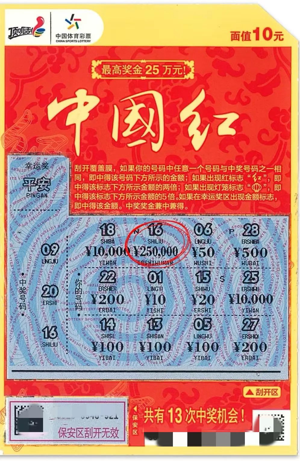 6月27日上午11点多,河南体彩南阳分中心兑奖大厅迎来了一位满脸喜悦的张女士(化姓),她购买的体彩顶呱刮面值10元的“中国红”中得了25万元头奖。