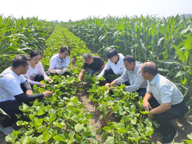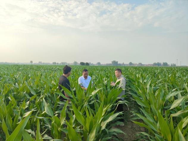 在朱襄镇周庄村的高标准农田里,农技人员正俯身查看玉米株高、叶片状态及田间墑情,结合实际为农户制定针对性管理方案。