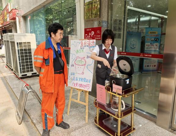 针对到店客户及周边居民,黄河路支行安排专人熬制绿豆汤等消暑饮品,免费提供矿泉水等饮品。为确保饮品卫生与品质,支行采购了新鲜绿豆、优质茶叶及环保一次性杯具。同时,支行还特别关注老年客户群体,安排大堂经理主动为行动不便的老人递送饮品,并提醒他们注意防暑降温。