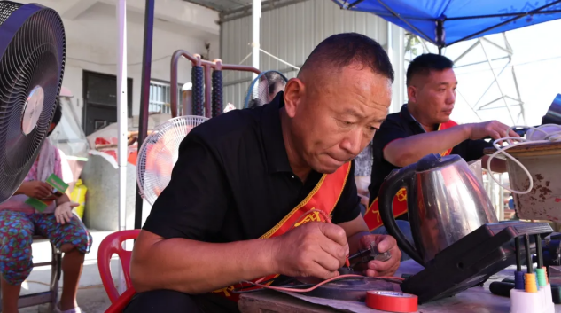 不远处的“爱心家电维修”摊位前,“商丘好人”李金亮正专注地拆卸一台电磁炉。电水壶的底座、电吹风的线路、刮胡刀的刀片……村民们送来的小家电在他手中逐一“康复”。“您这电水壶是底座接触不良,我给您换个配件,以后用的时候别沾水。”维修间隙,他还手把手教大家简单的故障排查技巧。这位坚持公益维修二十余年的志愿者,累计为军烈属、孤寡老人等群体修复家电超万件,每年自掏腰包补贴配件费2万多元。活动中,他朴实讲述着自己“修家电修出幸福感”的故事,那句“能帮大家省点钱,比啥都强”的心里话,赢得满场掌声,也让“奉献、友爱、互助、进步”的志愿精神直抵人心。