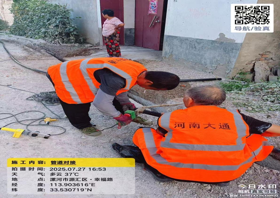 在源汇区大刘镇皇玉村,正在施工的城乡供水一体化工程项目现场,整齐划一的供水管道沟槽露出湿润的泥土,施工人员操控挖掘机、切割机忙碌作业,村干部、技术人员现场巡查,规范施工细节,忙碌又充满秩序。