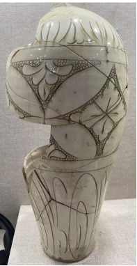 数量和器型:从数量上说这类瓷器在所有窑址出土瓷器中占比小,以清凉寺窑2-4次考古发掘情况看,一期只有一小片标本(图二十),而且还不是典型此类产品,是不是产自清凉寺窑口,也难以确定。二期不见,三期也只拼接出4件梅瓶,四期拼接出2件梅瓶,另有2件梅瓶标本和2片珍珠地瓷罐和1片白釉珍珠地瓷盆标本。比起动辄成千上万的白瓷、黑瓷、青瓷实在是微乎其微,在两窑产品中所占比例极低,烧造时间也短,存世数量不仅低于花瓷、普通白瓷、普通黑瓷、普通青瓷,而且也少于三彩、钧瓷、酱釉、兔毫、汝瓷、白底黑花等特殊品类。在以出土瓷器为主的叶县文集遗址和鲁山杨南遗址中,也是同样情况,这类瓷器所占比例极低。文集遗址也就拼兑出2件梅瓶标本、杨南遗址拼兑出3件瓷枕标本。杨南遗址出土白釉珍珠地梅瓶残片9片,没有复原出一件;白釉珍珠地瓷枕瓷片33片,复原出3件。目前共收集到这类瓷器34件(考古学上能够基本复原或者能够看出器型),这类瓷器器型绝大多数为梅瓶和枕,其中梅瓶22件、瓷枕9件,另外有罐残片标本2件、盆1件。可见,梅瓶占绝对多数,其次为瓷枕。能够查找的梅瓶尺寸最大的是段店窑采集的白釉珍珠地划花褔寿梅瓶(见图七,现藏鲁山窑段店文化研究所),口径6.5厘米,足径10厘米,高46厘米。最小为河南博物院白釉珍珠地划花梅瓶(见图二十四),口径5.5厘米,足径9厘米,高38.5厘米。