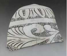 (图六,白釉篦划水波纹元本张家枕,北宋,段店窑址采集,现藏鲁山窑段店文化研究所)