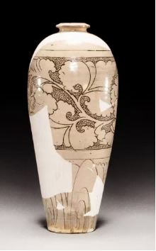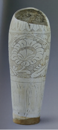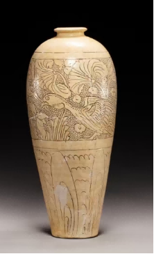(图三,白釉高体刻划珍珠地牡丹纹梅瓶,文集遗址出土,原文定为金)
