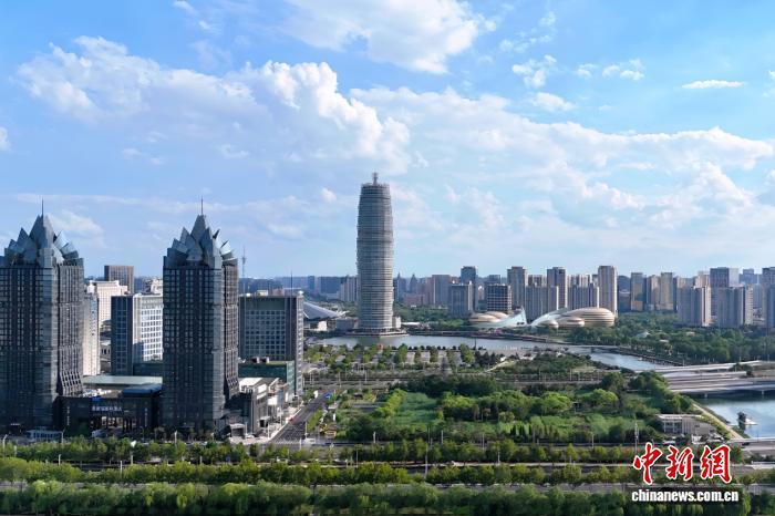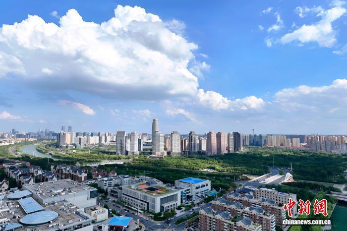 8月20日,初秋的河南郑州上空蓝天白云,与市区的现代楼宇相映成趣,仿佛一幅高清的“动态壁纸”。图为俯瞰郑州郑东新区中央商务区。(无人机照片)中新社记者 李超庆 摄